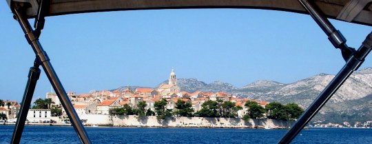Korcula unterm Bimini-Topp, im Hintergrund Peljesac