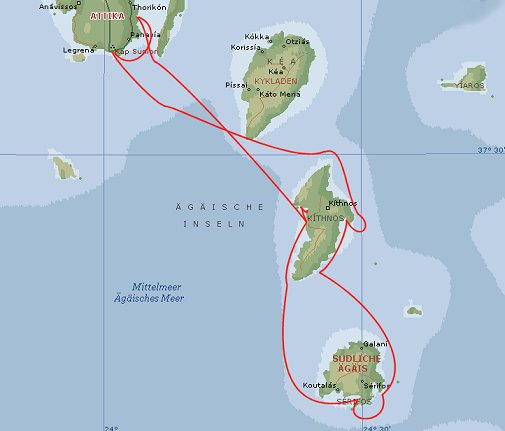 ![]() O.Fikada/Kithnos - O.Mega Livadi/Kithnos - Livadi/Serifos - Ayos Stefanos/Kithnos - Kap Sounion - Lavrion 124 sm unter Segel - 17 sm unter Motor 141 sm gesamt |